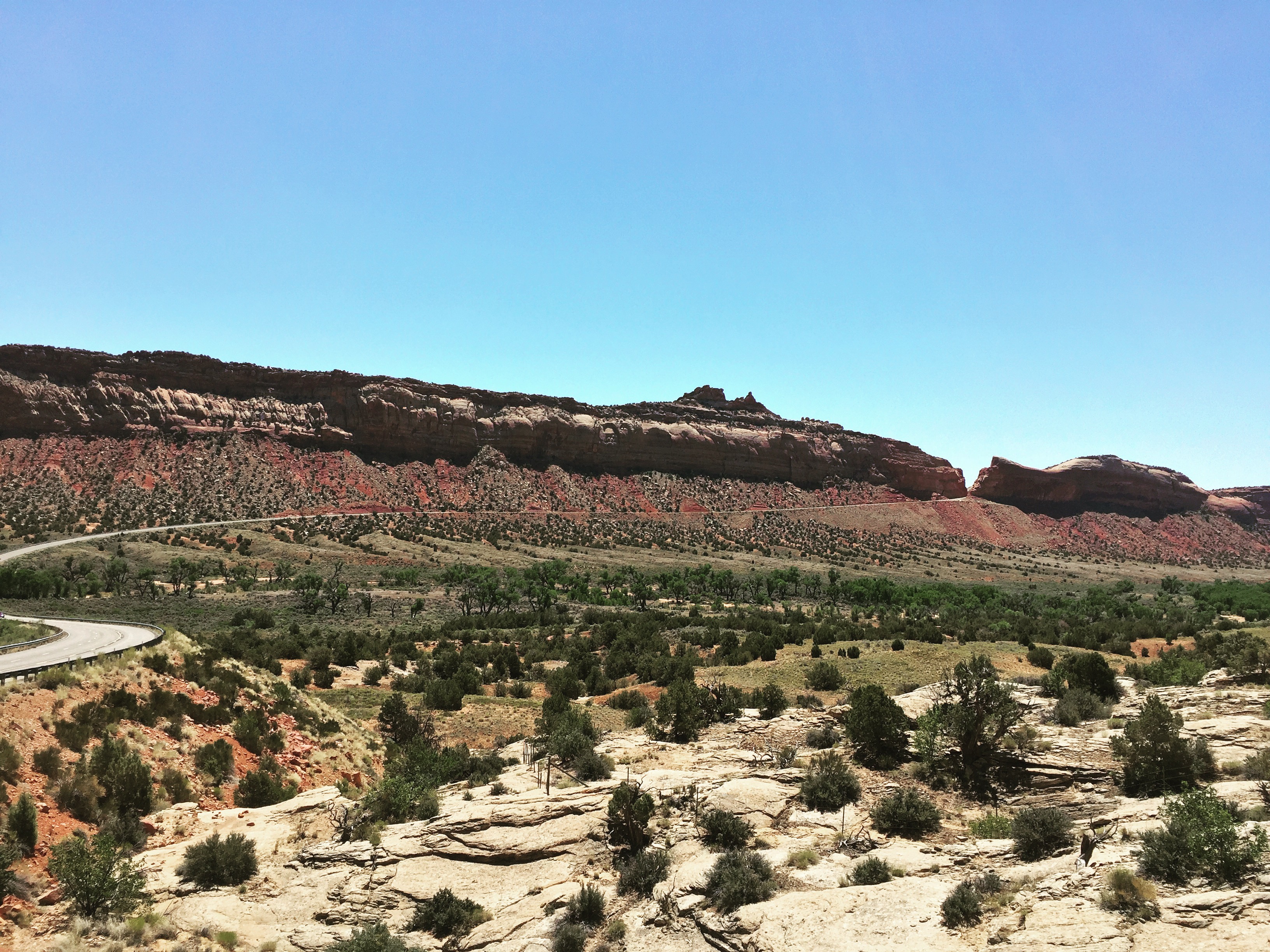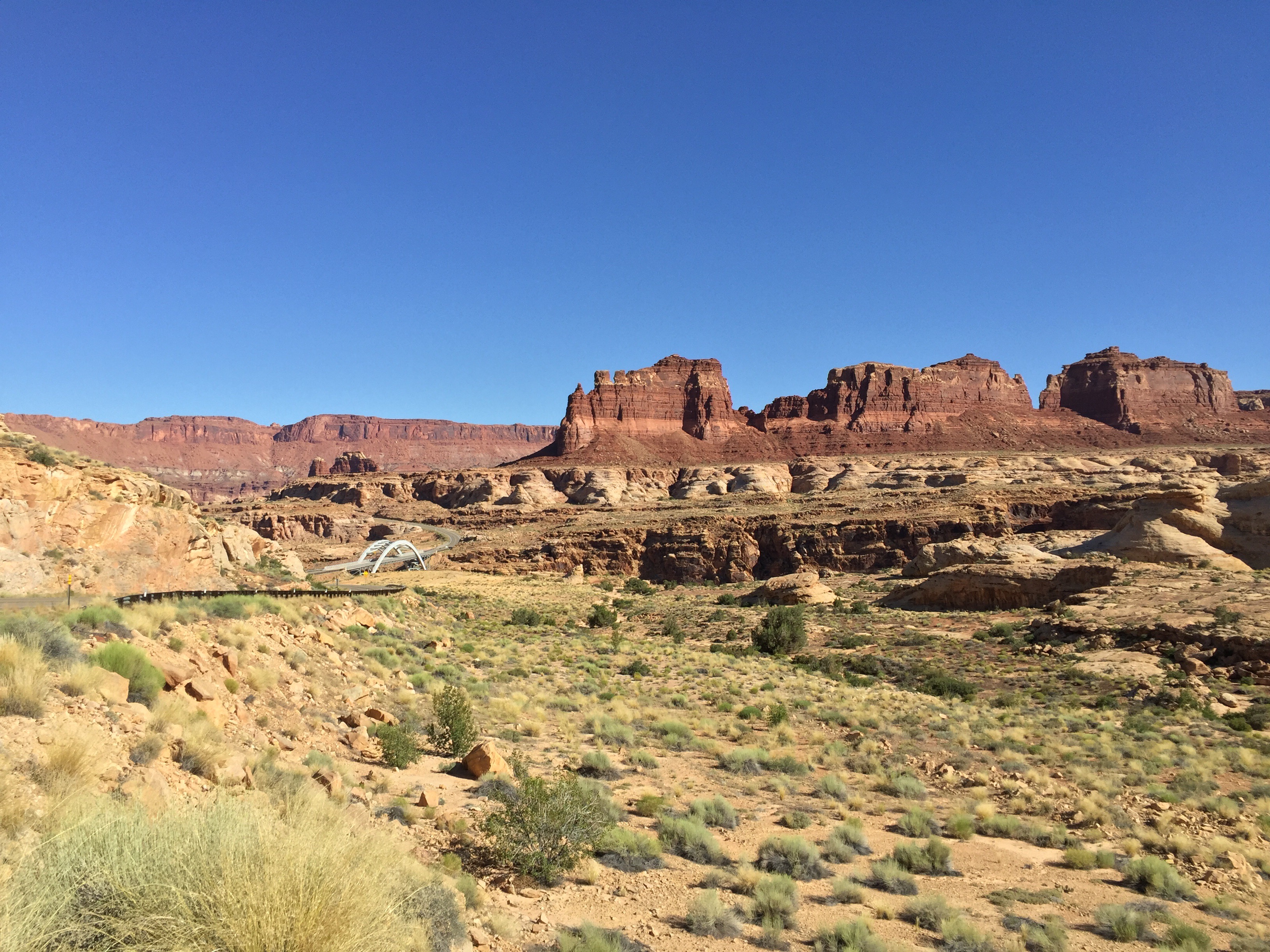 We made one quick double-back to grab a snapshot of the bridge over the Colorado River, but then pushed on with all of us commenting on the colors of the rock formations. I think that my most consistent exercise during this trip (so far) have been my frequent photographic forays. I’ll pull the car over and hop out, and then find myself scrambling to the top or bottom of the nearest hill or ledge to get a clear shot or to frame the picture better. This is quite often followed up by an impulse to make a quick jaunt over the next hill as well…